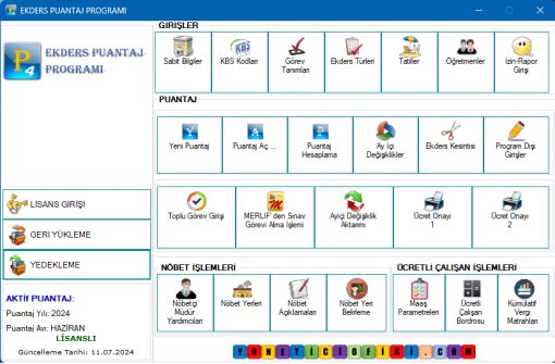 2. Öğretmenlerin haftalık ders saatleri, nöbet günleri, rehberlik veya sosyal kulüp günü, egzersiz çalışmaları, takviye kursları program bilgileri bölümünden sene başında bir kere giriş yapılır. 3. Sevk, rapor, izin bilgileri Öğretmen Girişleri bölümünden yada günlük rapor -izin girişi bölümünden girilir. 4. Varsa diğer sınav, belletmenlik gibi ayrı ekders görevleri program dışı girişler bölümünden girilir. 5. Öğretmen ekders puantajları, hafta yarım kalsa bile öbür aya aktarılacak şekilde haftalık olarak ayrı ayrı otomatik hesaplanır. 6. Ekders türleri bölümünden yeni ekders veri türü elle girilebilir ve değiştirilebilir. 7. Hangi ekders türü Ders dışı hazırlık ve planlama görevine dahil olduğu Ekders Türleri bölümünden belirlenebilir. 8. Bir yıldaki tüm tatiller elle girilir. 10. KBS excel dosyası tam uyumlu olarak hazırlanır. 11. Program tarafından 2 adet ücret onayı verilmektedir. Excele aktarılarak gerekli düzenlemeler yapılabilir. 12. Veritabanı yedekleme ve geri yükleme işlemleri yapılabilir. Demo olarak kullanımda; raporlarda filigran çıkmaktadır. Raporlar excel' e aktarılamaz, KBS excel dosyası oluşturulamaz. PROGRAMIN YILLIK ÜCRETİ 1.200 TL dir.