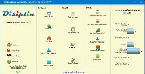 ÜCRETLİDİR. Lisedeki Ödül ve Disiplin Kurulu, Ortaokulda ise Öğrenci Davranışlarını Değerlendirme Kurulu iş ve işlemlerini hızlı ve kolay yapılmasını sağlayan, kurul çalışmalarında kullanılan evrakların bulunduğu bir programdır. KULLANICI ADI : Ctrl + z
