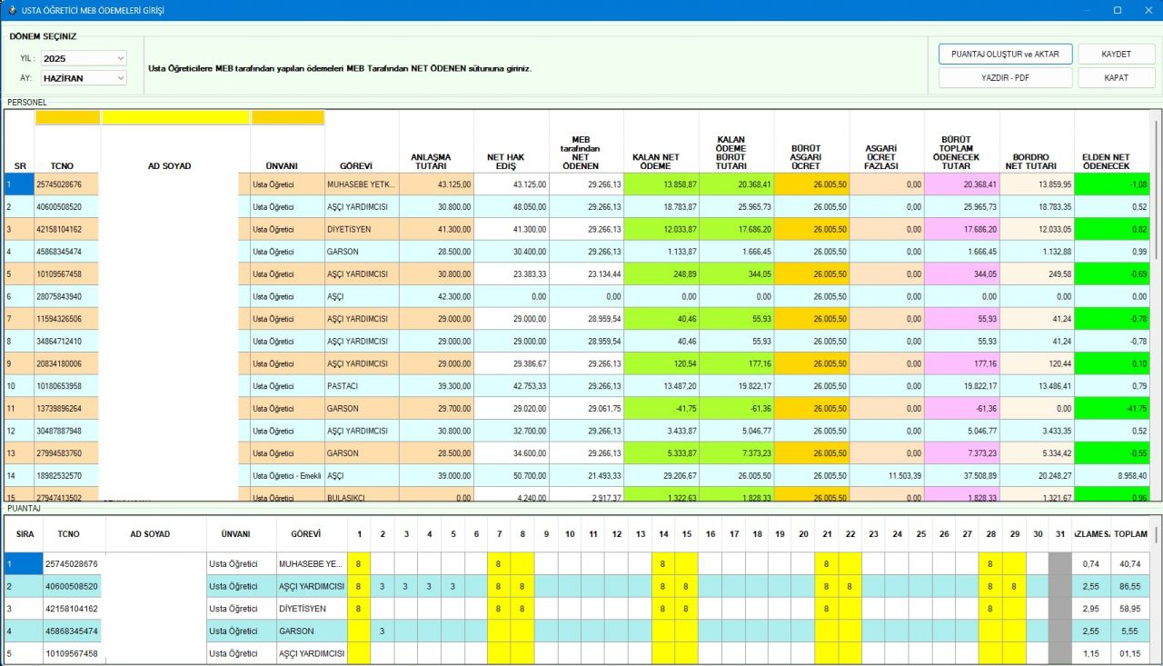 PROGRAM HAKKINDA 1) Usta Öğretici ve Öğrenci Puantajları Koordinatör öğretmenler için excel şablonu şeklinde hazırlanır. Bu şablonu dolduran koordinatör öğretmenler, Teknik Müdür Yardımcısına gönderir ve hızlıca programa çekilir ve bordroları hesaplanır. 2) MEB tarafından Usta Öğreticilere ödenen pirim ödemeleri programa işlenir. MEB Pirim Ödemesinden sonra kalan ödemeleri günlük puantaja dönüştürülerek bordroları hesaplanır. 3) Bordroları hesaplanan personel ve öğrencilerin ücret tutarları banka listesine aktarılır ve banka ödemesi için excel şablonu oluşturulur.